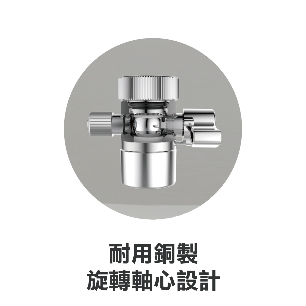 - 100%铜製分水器,大流量出水设计,内部止水结构为铁氟龙球状材质设计, 保证无毒耐磨