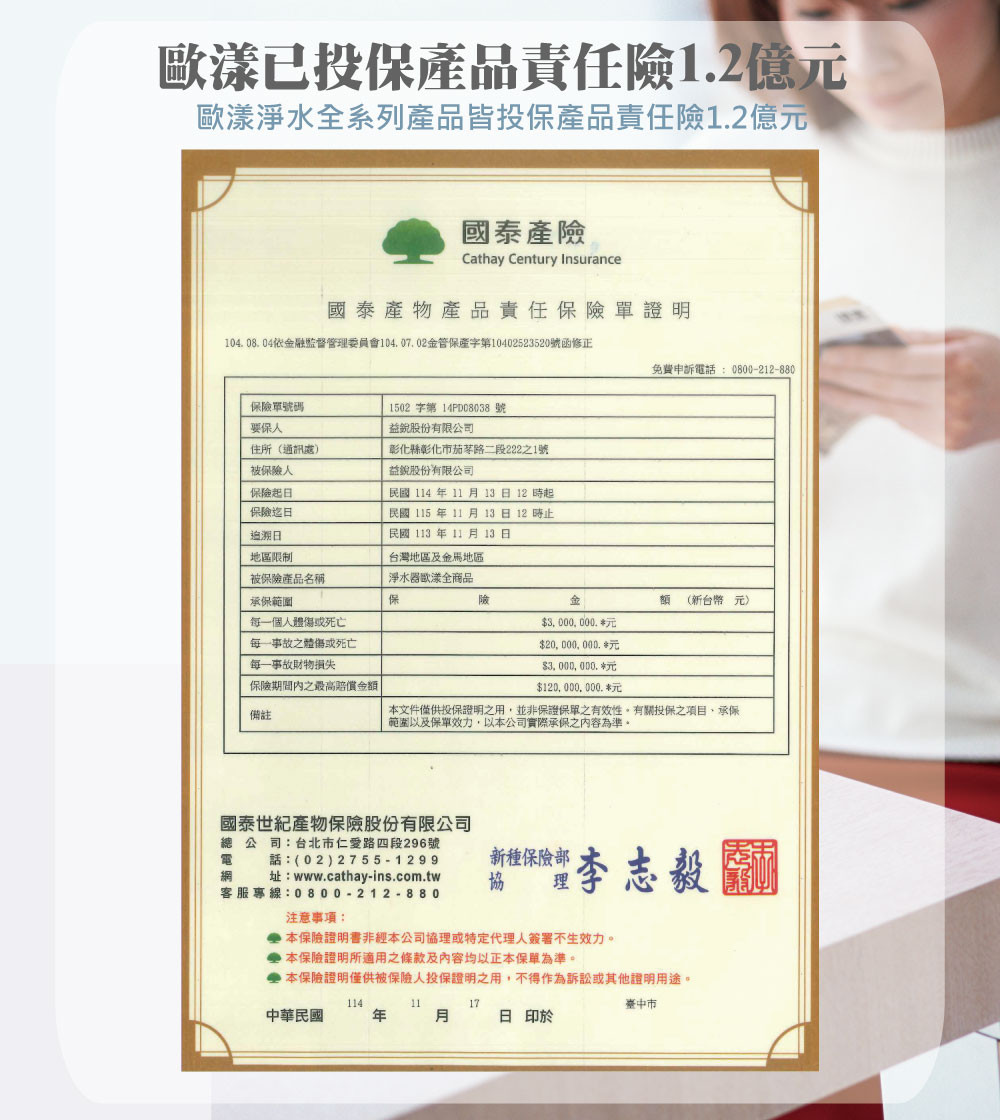 1.每年購買新台幣 1.2億元國內產品責任險,為的是保障客戶的購買權益。