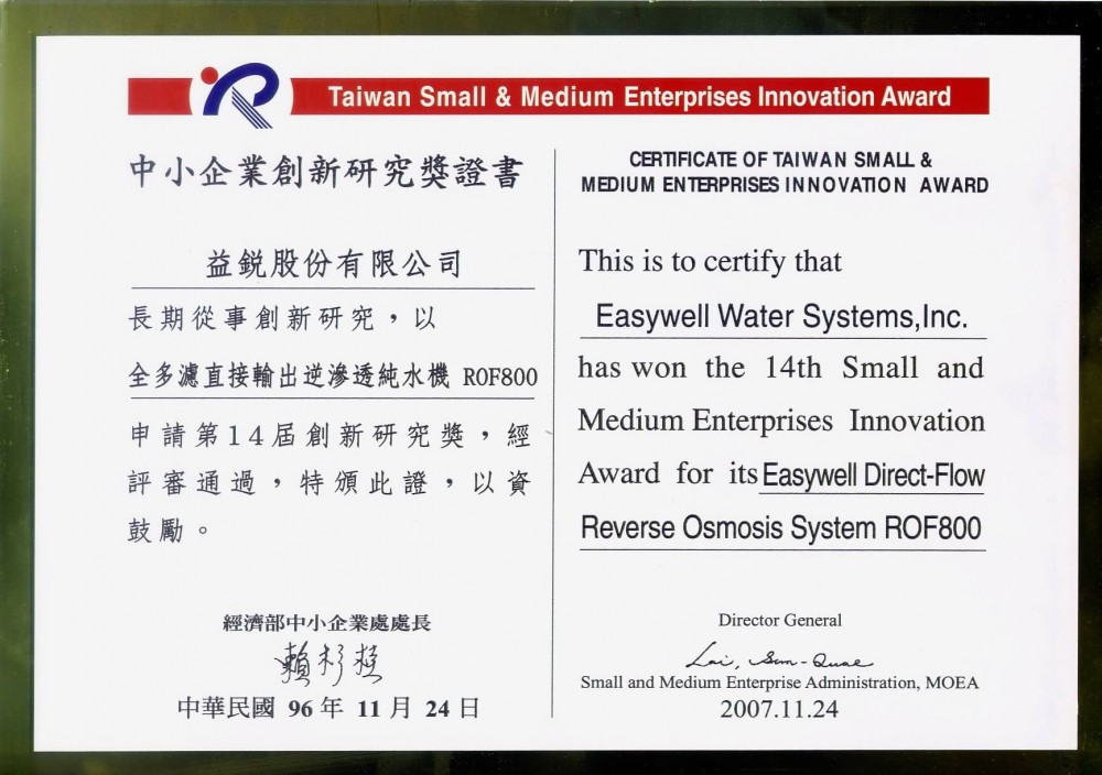 | 而且益銳公司(歐漾淨水)的這項產品還榮獲台灣經濟部的創新研究獎。 |